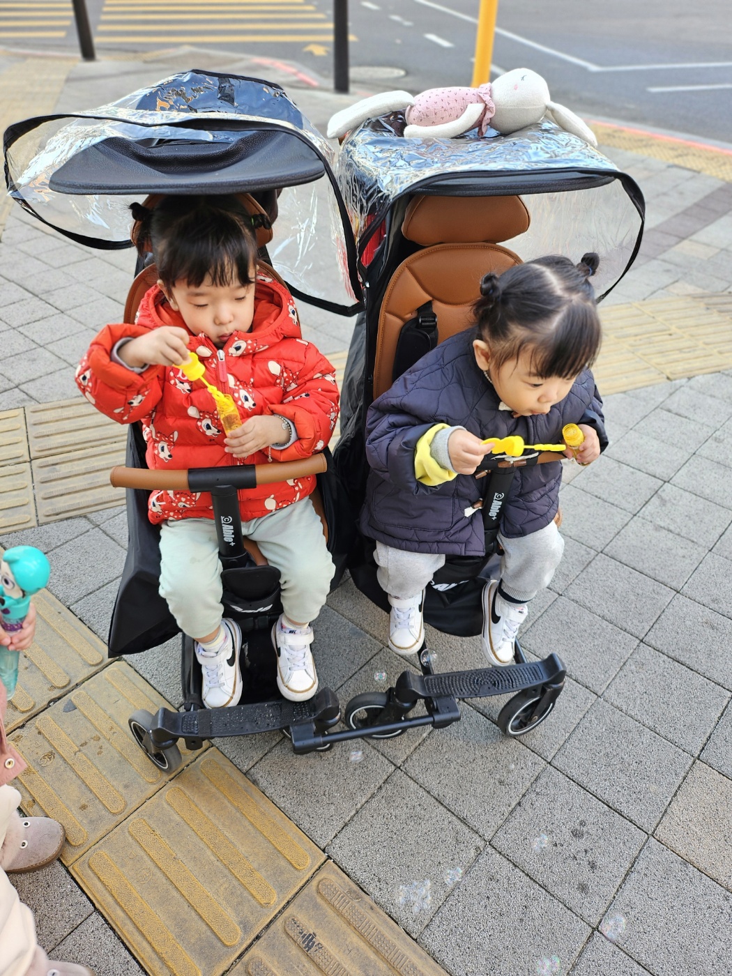 두 개의 유모차가 하나로 결합될 수도 있고, 필요하면 한 명만 태우고 다닐 수도 있어서 외출할 때 정말 편리해요. 예를 들어, 한 명이 어린이집에 가야 할 때는 다른 한 명만 데리고 산책을 갈 수 있는 거죠. 저희 아이들 작년 여름에 자기꺼라고 하나씩 끌고 가는게 귀여워서 찍어뒀어요ㅎㅎ
