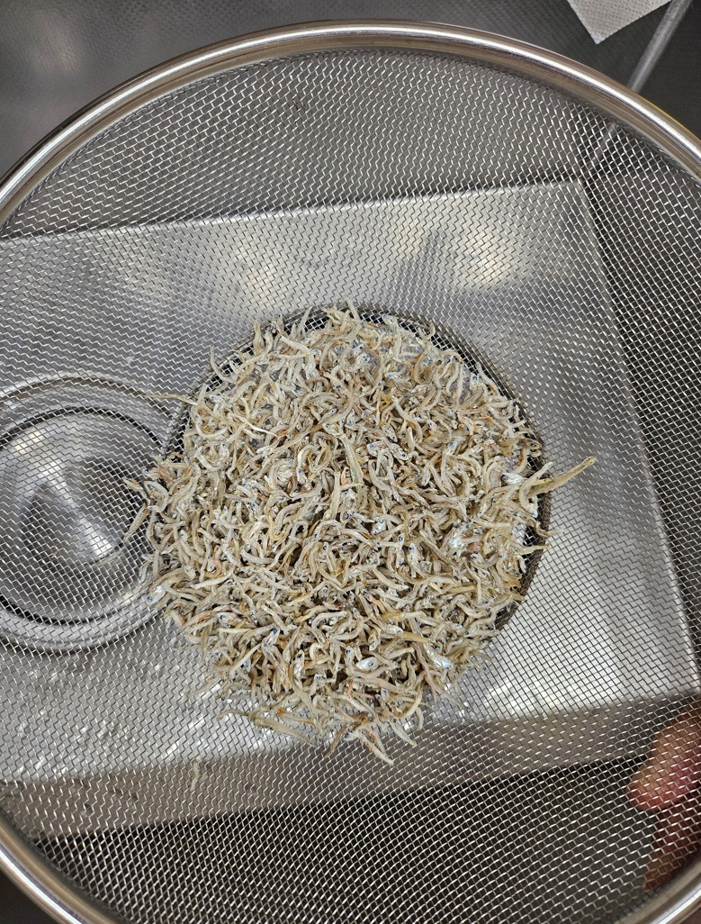 볶은 멸치는 체에 한 번 쳐서 부스러기나 가루를 털어내고, 다시 팬에 담아요.