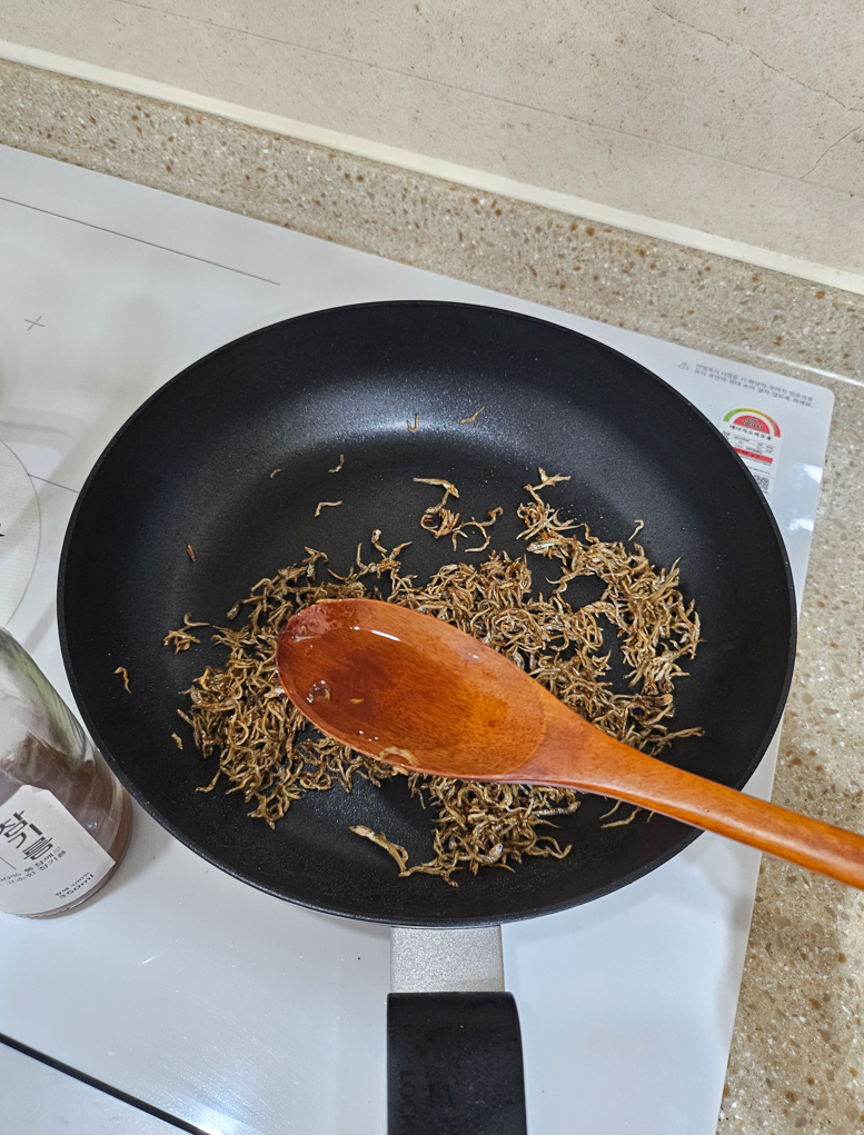 잔멸치를 마른 팬에 한 번 살짝 볶아 비린내를 날려줘요.