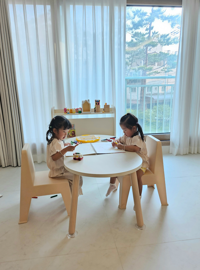 두 아이가 나란히 앉아도 공간이 여유 있어서 함께 쓰기에도 딱 좋고요.